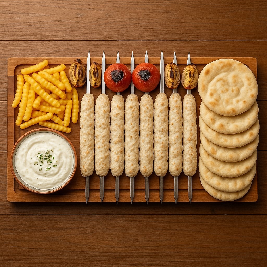كباب دجاج مشوي على الفحم يُقدّم مع صلصة الثوم وبطاطا مقلية وخضار مشوية و8 أرغفة خبز عربي. مثالي للمشاركة.