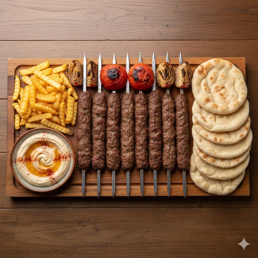 One KG Charcoal-grilled kabab Halabi served with hummus, grilled vegetables, French fries and 8 Arabic breads. Perfect for sharing.واحد كغ كباب حلبي مشوي على الفحم يُقدّم مع حمص وخضار مشوية و بطاطا مقلية و8 أرغفة خبز عربي. مثالي للمشاركة.