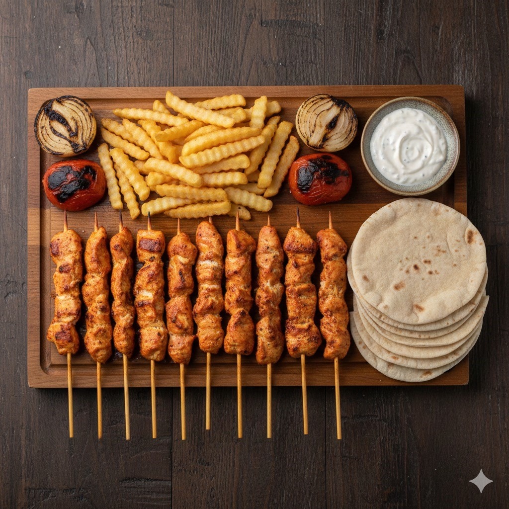 شيش طاووق طري ومشوي على الفحم يُقدّم مع صلصة الثوم وبطاطا مقلية وخضار مشوية و10 أرغفة خبز عربي. مثالي للمشاركة.