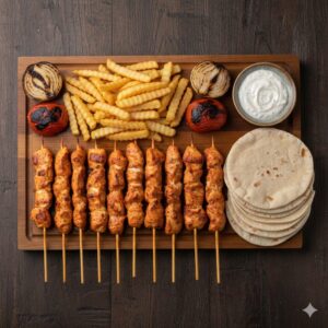 Charcoal-grilled chicken kabab served with garlic sauce, French fries, grilled vegetables, and 8 Arabic breads. Perfect for sharing.