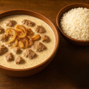 لحم طري مطهو ببطء في صلصة لبن ناعمة ممزوجة بالبصل والثوم والتوابل الشرقية — طبق مشرقي أصيل يبعث على الدفء والراحة. يُقدّم مع الأرز.